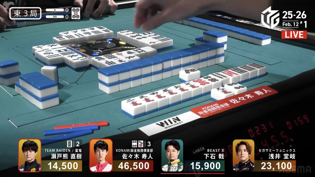 を瀬戸熊から捕らえる。寿人が12000のアガリでさらに点棒を積み上げる。