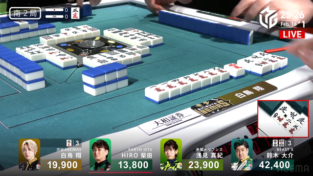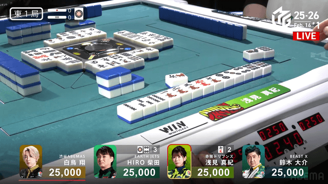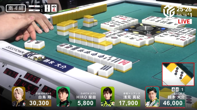 待ちで先制リーチ。浅見は高打点が期待できたが、結果は浅見に加え、白鳥と大介がテンパイを取り切り3人テンパイで流局となった。