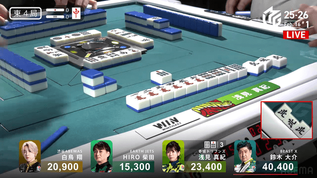 待ちでテンパイ。そこに追いついた柴田がリーチをするが宣言牌の