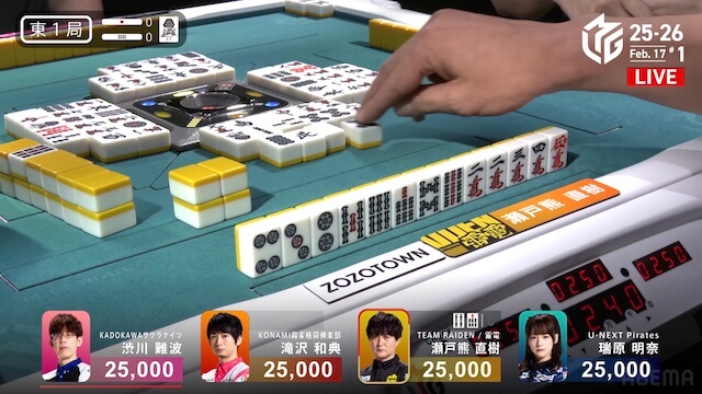 をポンしてソーズに向かう。しかし、ファーストテンパイを入れたのは瀬戸熊。9巡目に先制リーチで攻勢をかける。滝沢が最終盤にテンパイを入れると、カン
