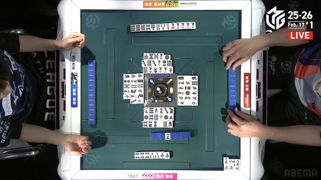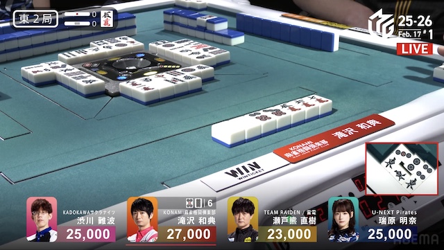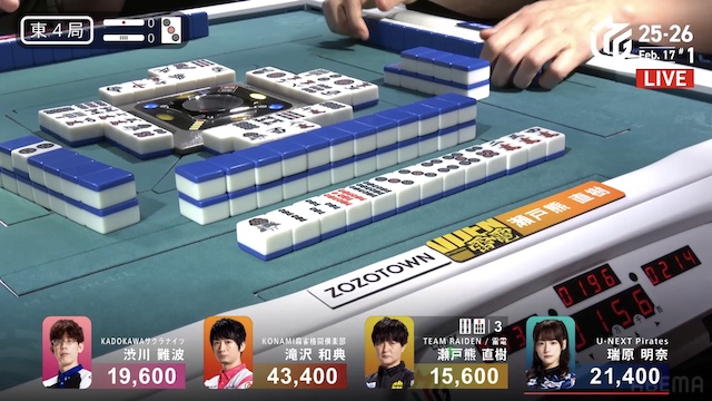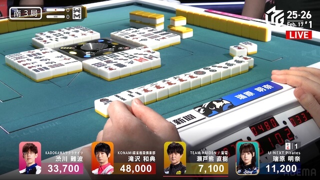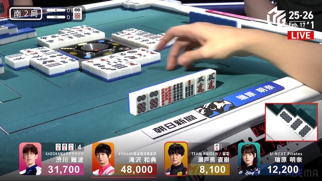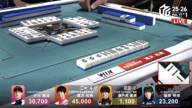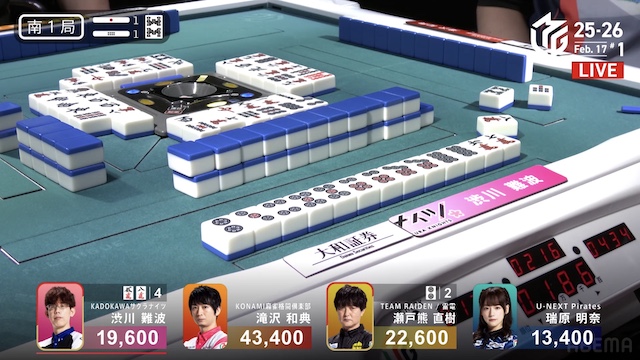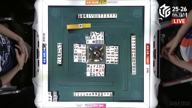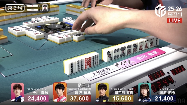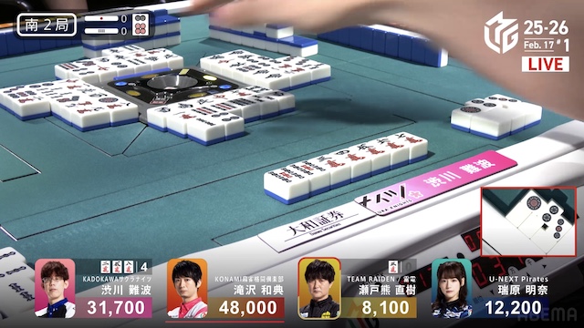 待ちの三面張で勝負をかけた。渋川は、瑞原のテンパイ打牌をとらえて1000のアガリ。トップ目の滝沢を追いかける。