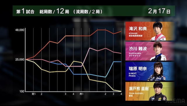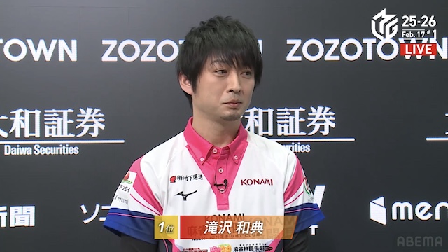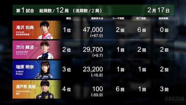 南4局、4着目の瀬戸熊が先制リーチ。仕掛けていたトップ目の滝沢が追いつき、瀬戸熊の現物待ちで息をひそめる。最後は滝沢が競り勝って、ロンアガリ。トップを守り切ってゴールとなった。