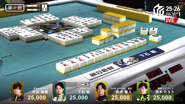 の三面張で先制リーチ。萩原は終盤に粘り込んでテンパイを取り、二軒テンパイで流局した。東3局が1本場から始まる。供託が1本。たろうが