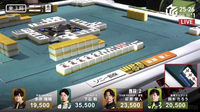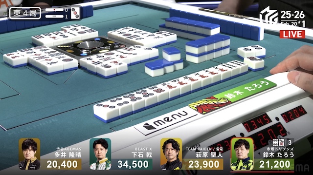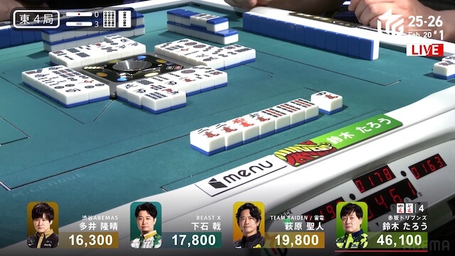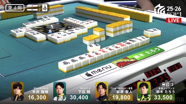 待ちの三面張でトップ目をねらう。下石は二副露目を入れてイーシャンテンになるが、たろうが萩原からロンアガリ。3900を加点し、たろうがトップ目に立ってオーラスへ。