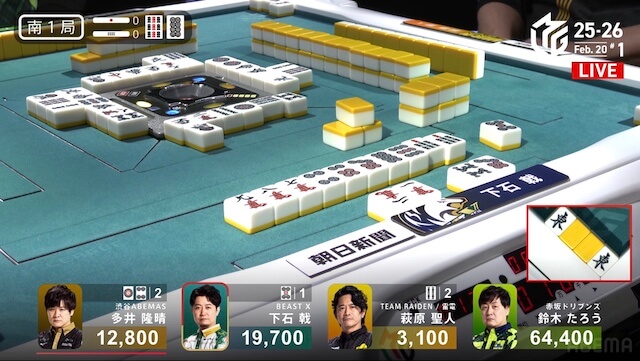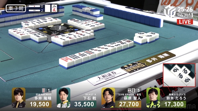 南4局、トップ目たろうと2着目下石の点差は3100点。下石の一軒テンパイ、もしくはたろうの一軒ノーテンなら逆転する。多井が