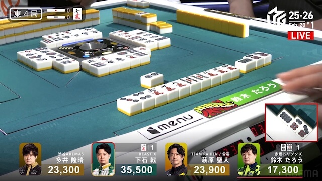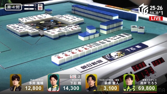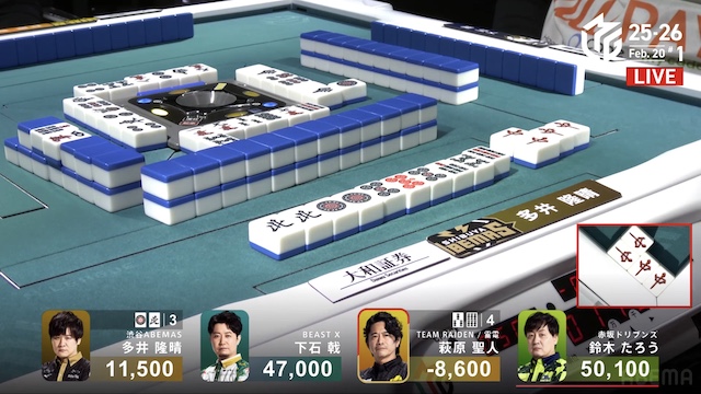 ポンから発進し、加カンして前に出る中、萩原が先制リーチ。しかし、多井が危険牌を押し、テンパイをキープすると、最後は下石からロンアガリ。6400で着順変わらず、試合終了となった。