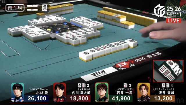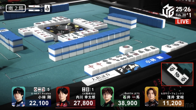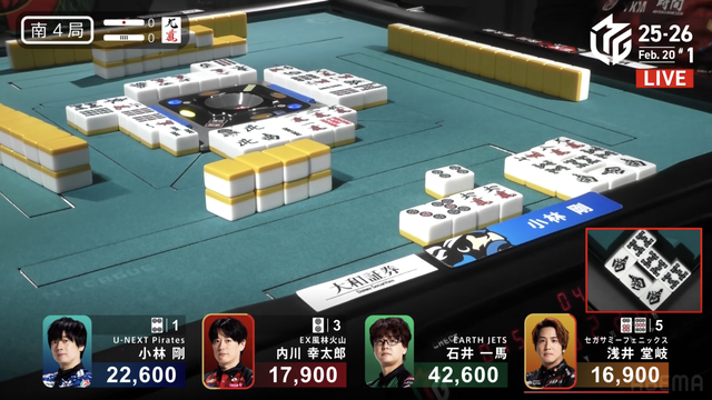 南4局、再び小林が躍動。2軒リーチに対して3副露で攻め抜き、内川から3900を打ち取って、小林は2着をキープ。内川は堂岐と入れ替わって4着になり、試合が終了した。
