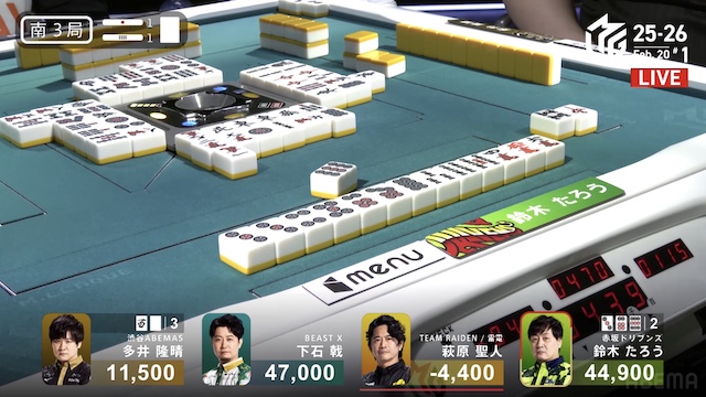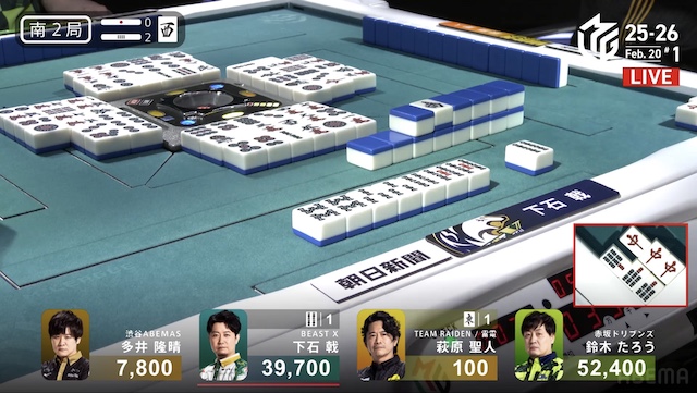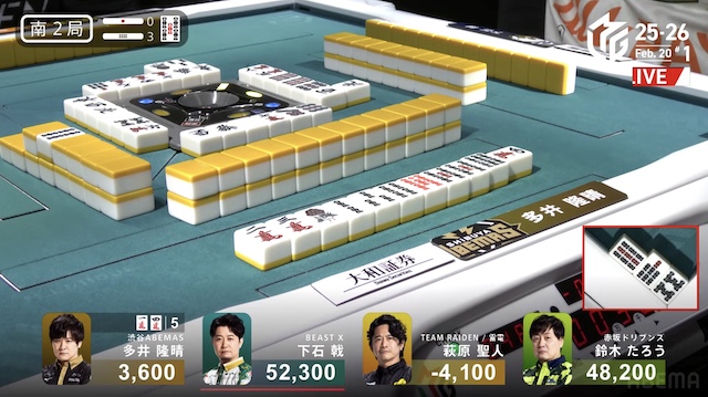 南2局、親で2着目の下石が先制リーチで、4着目の萩原は二副露で、互いにテンパイを入れてめくり合う。しかし、萩原は下石への危険牌を持ってきてオリを選択。流局となった。続く南2局1本場、供託が1本ある。トップ目のたろうが5巡目に先制リーチをかけると、2着目で親の下石が12巡目に追いかけリーチで対抗。最後は下石がたろうからロンアガリ。7700は8000を直撃し、トップをめぐる争いが激化する。