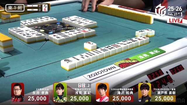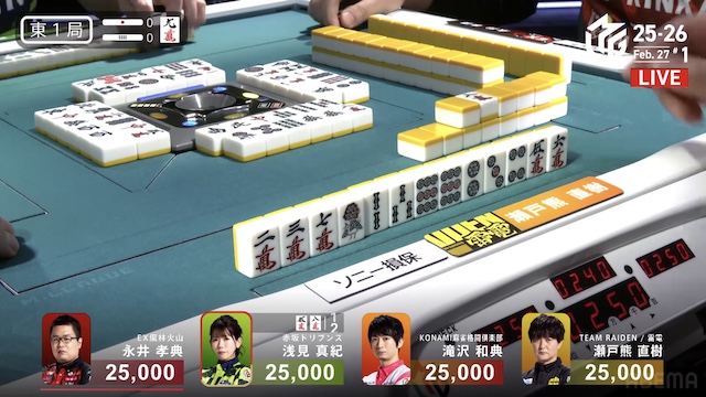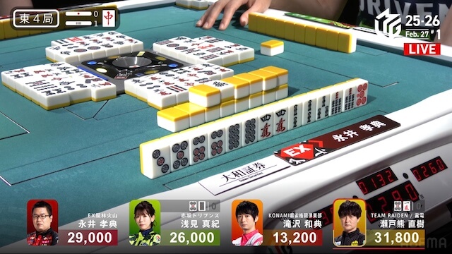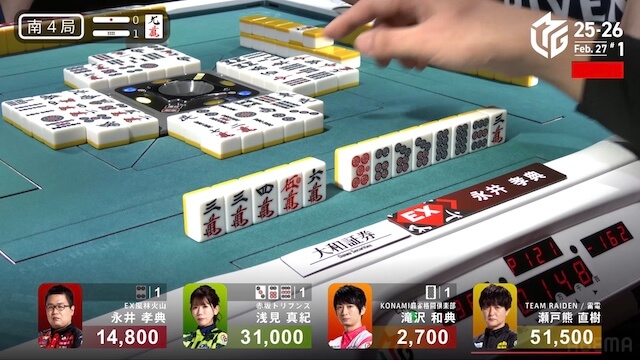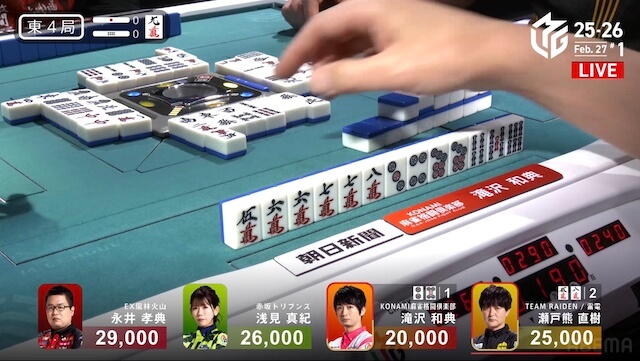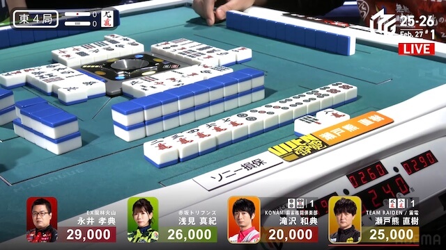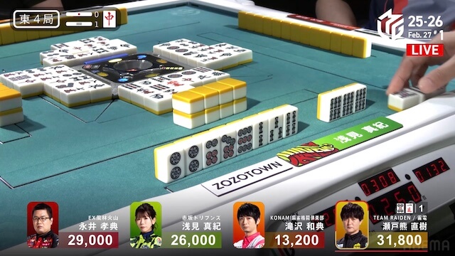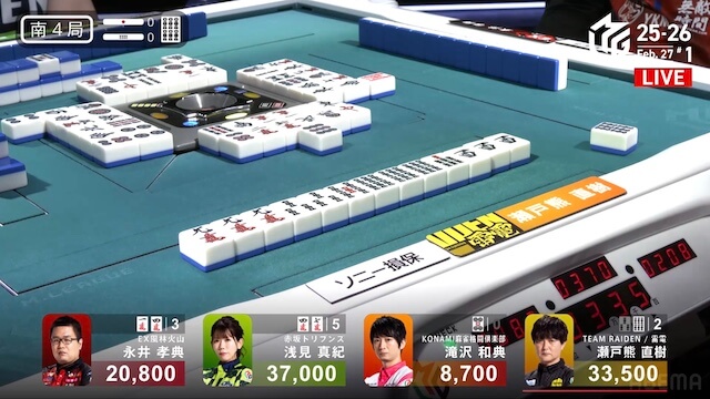 南4局、トップ目の浅見がファーストテンパイ。2着目で親の瀬戸熊が門前で追いつくが、役がないため出アガリすることはできない。永井が追いつき、さらに滝沢にもテンパイが入った後、瀬戸熊が4枚目のドラである