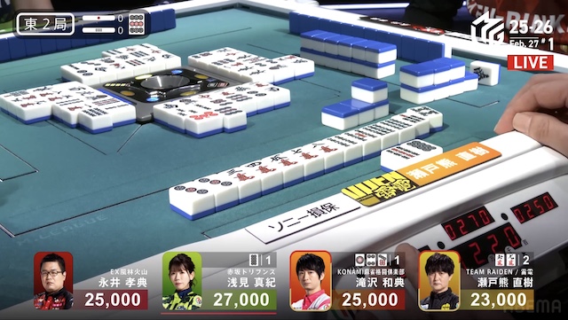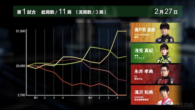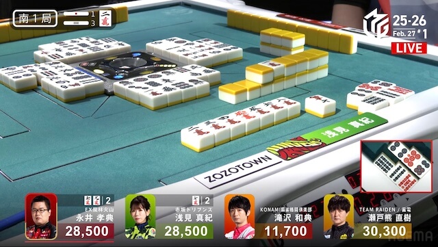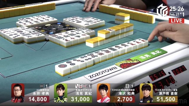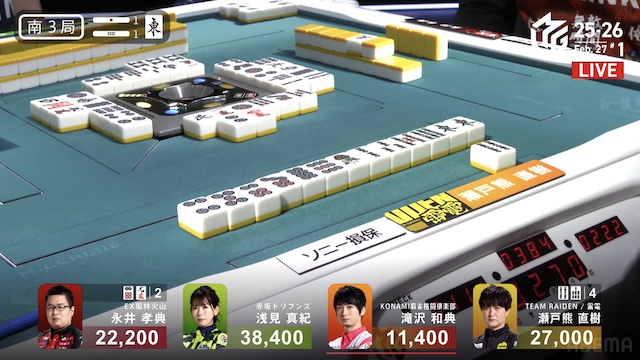 待ちの追いかけリーチで応戦する。親の浅見はチートイツで追いつき、ダマテンに構えて息を潜めたが、瀬戸熊が滝沢からロンアガリ。浅見のテンパイは空を切った。