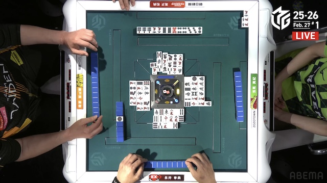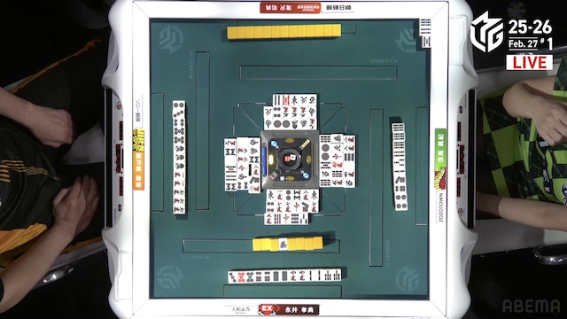 待ちが山に2枚ある。他家が丁寧に対応する中、永井は悠々とツモアガリ。1000・2000で、3着目から一気にトップ目まで駆け上がる。