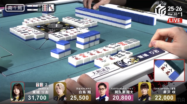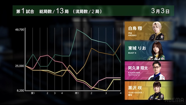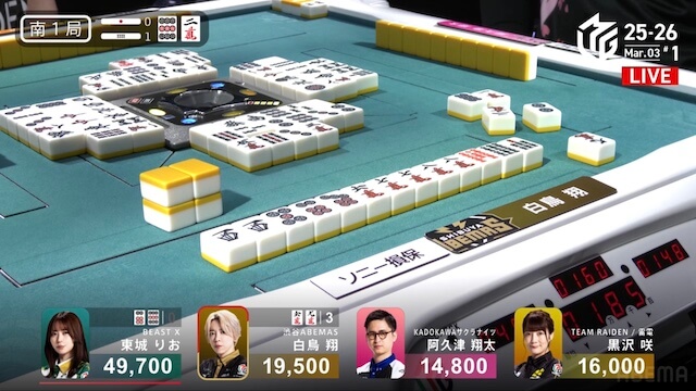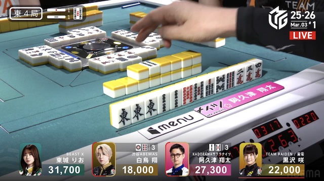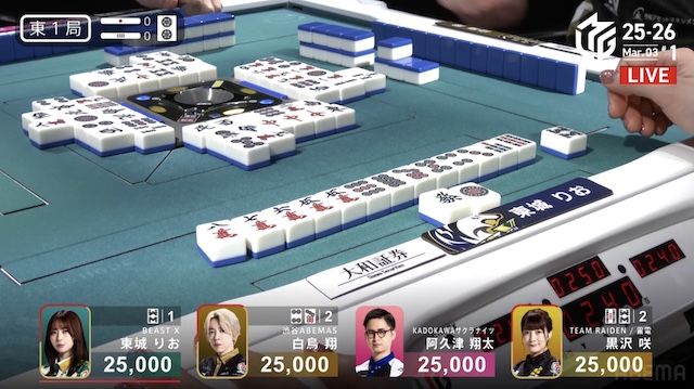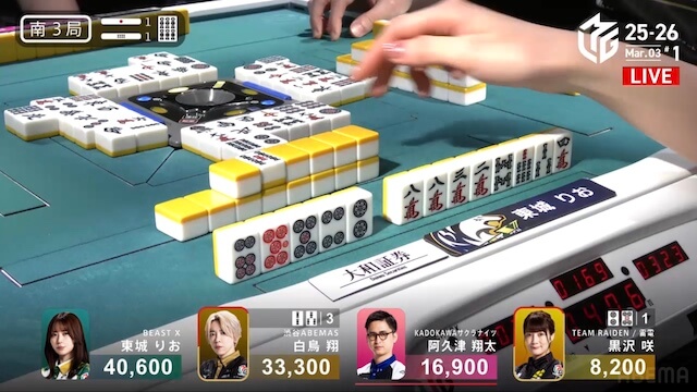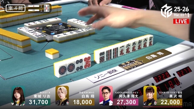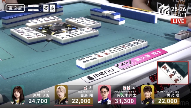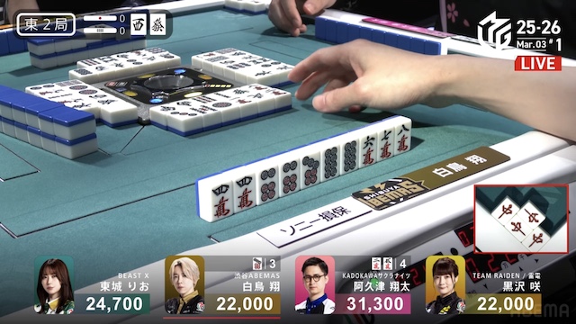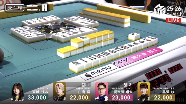 東1局1本場、白鳥が12巡目にホンイツ・チートイツをテンパイ。同巡、阿久津が一気通貫をテンパイし、両者ともにダマテンに構える。親の東城が門前でテンパイし、先制リーチを宣言したが、その宣言牌でロンアガリをしたのは阿久津だった。8000は8300を直撃し、トップ目に立つ。