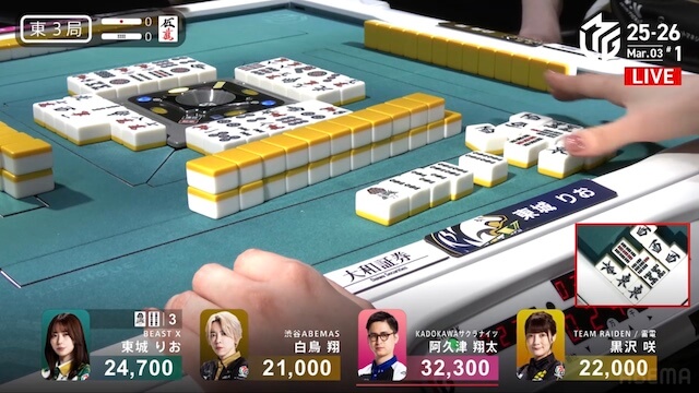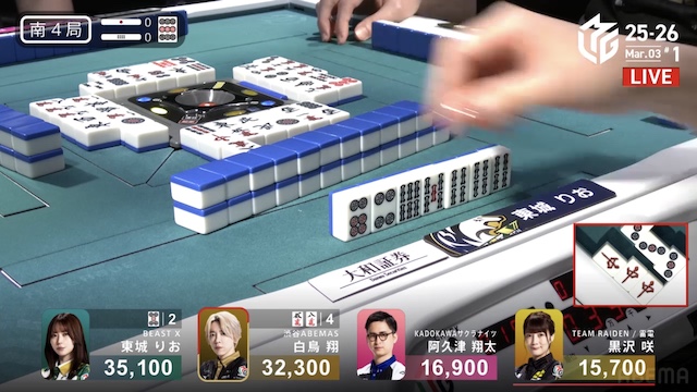 を加カンして攻勢に出る。阿久津が仕掛けてテンパイを入れると、白鳥からロンアガリ。1000点で白鳥の親を落とした。