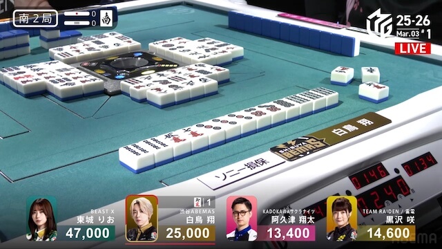 を暗カンして先制リーチ。場に圧をかけていく。阿久津は二副露目を入れて、ソーズに向かい、食い下がる。しかし、最後は東城がツモアガリ。裏ドラを2枚乗せて、6000オールを手にし、突き抜けた。