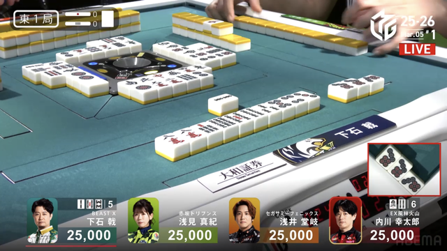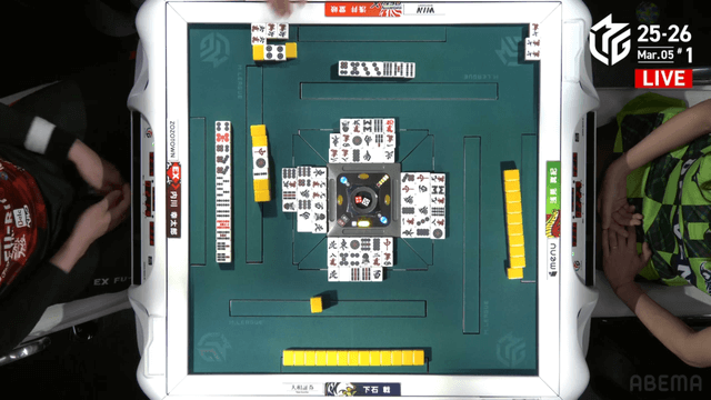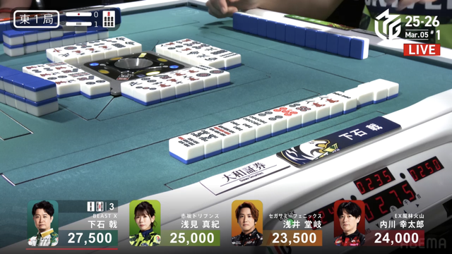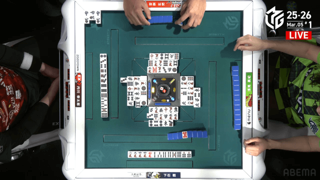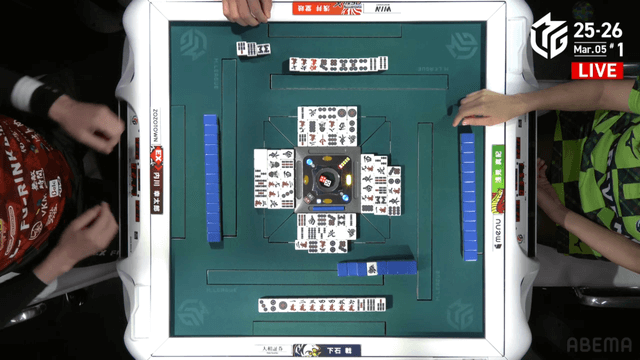 待ちのテンパイを入れる。堂岐が大物手のイーシャンテンに構えるも、下石がそのまま