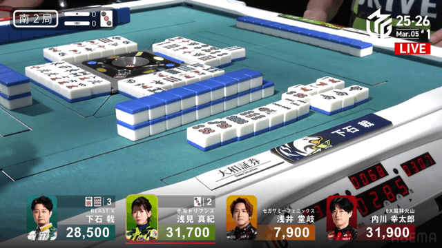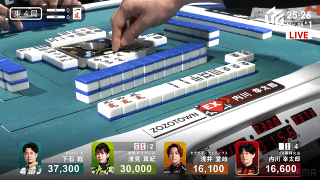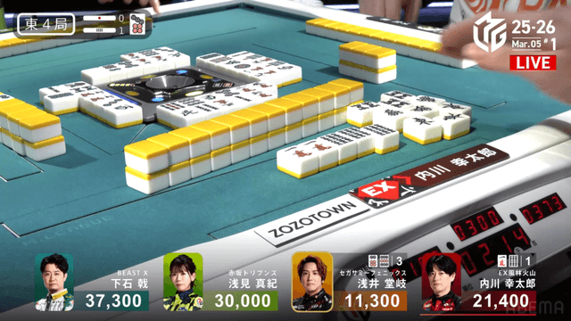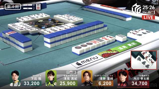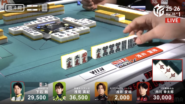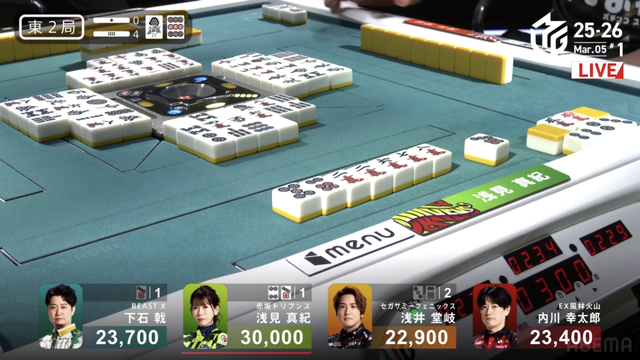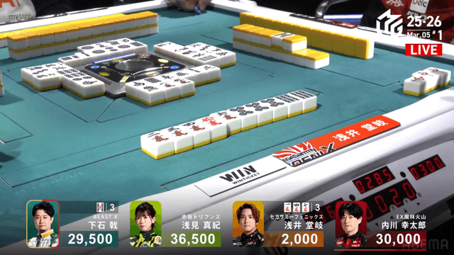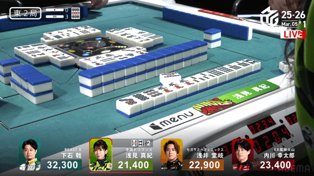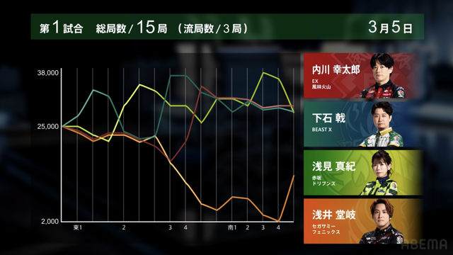 を放銃し、堂岐が8000のアガリ。このアガリによって浅見は痛恨の2着順ダウン、トップは内川のもとに転がり込む波乱の結末となった。