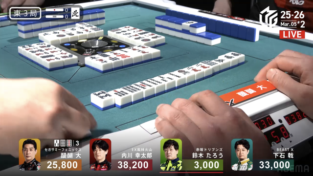 のシャンポン待ちをヤミテンにとる。8000のロン、3900を下石から直撃、あるいは1000・2000をツモると逆転することができる2番手の内川が
