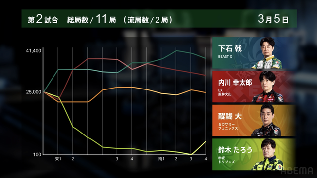をツモり、この半荘初めてとなる1000・2000のアガリを手にした。このアガリにより下石が逃げ切りトップを獲得した。
