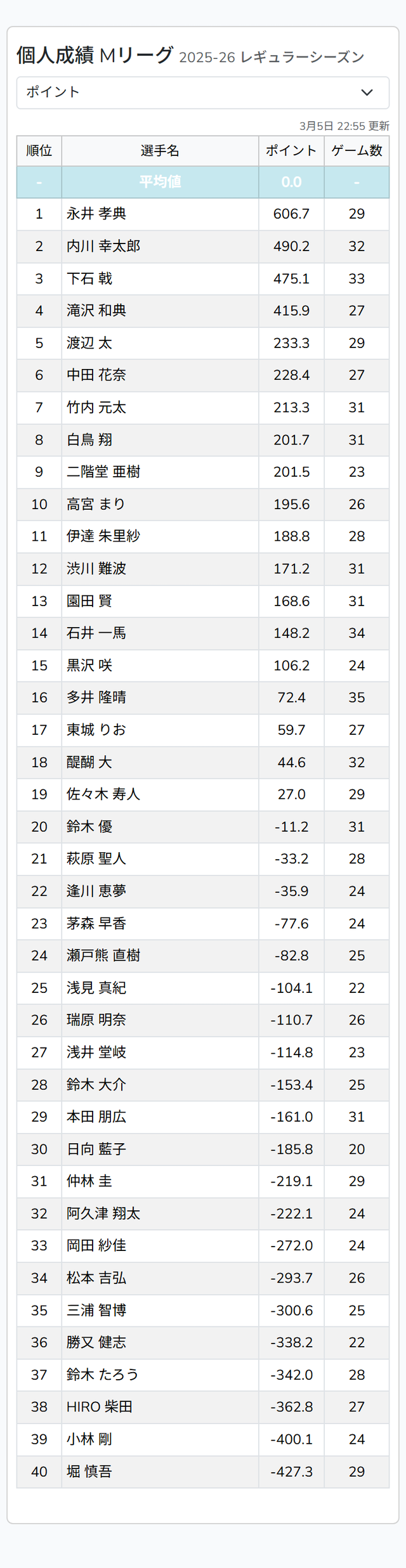4位 たろう(ドリブンズ)▲54.6