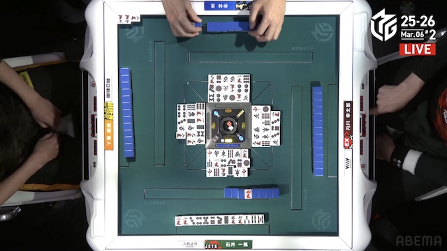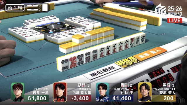 東1局3本場、親の一馬がファーストテンパイ。ダマテンに構え、待ちを変化させながらアガリをねらう。萩原は門前で11巡目にテンパイを入れ、先制リーチを敢行するが、その萩原の河に、一馬のアガリ牌があった。内川がリーチの現物を打つと、一馬がロンアガリ。12000は12900を加点して、リードを広げていく。