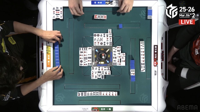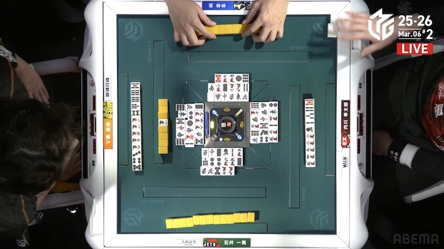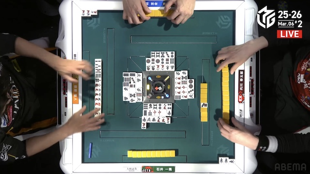 を暗刻にした一馬がテンパイを入れる中、親の内川がリーチを打って勝負に出る。萩原にもテンパイが入るものの、フリテンのため、出アガリはできない。最後は内川がツモアガリ。1000は1400オールを加点する。