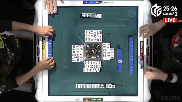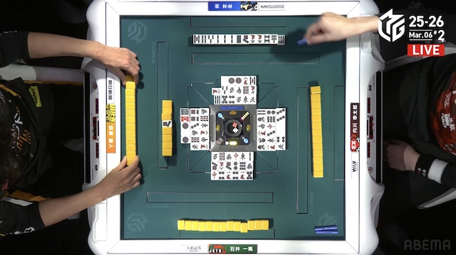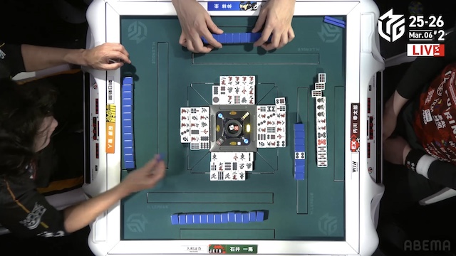 東4局1本場、親の萩原がテンパイするが、2度外して良形を求め、ツモ山に手を伸ばす。