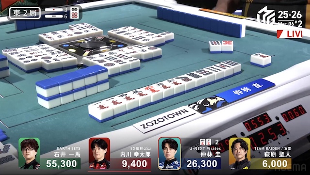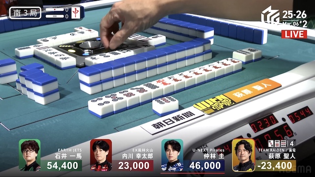 南4局、トップ目一馬と2着目仲林の点差は11000点。4着目で親の萩原が先制リーチ。箱下からの復活と連荘を目指す。一軒テンパイで流局した。