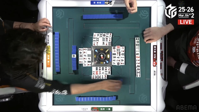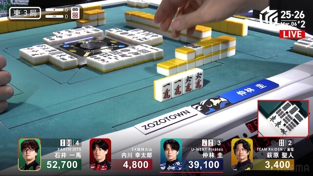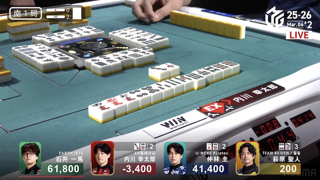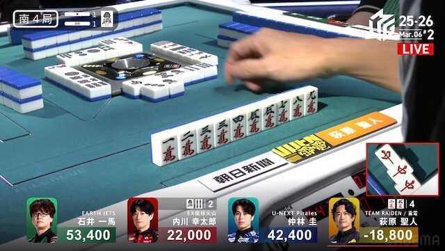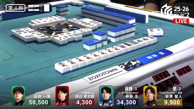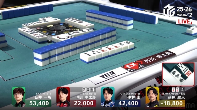 東1局4本場、仲林が三副露してファーストテンパイ。内川が門前で追いついて、リーチで対抗する。さらに親の一馬も追いかけリーチ。三軒によるめくり合いになる。しかし、仲林・内川のアガリ牌は山から姿を消し、一馬のアガリ牌も残り1枚になると、最後の1枚は萩原の元へ。アガリは生まれず、三軒テンパイで流局した。