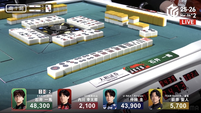 東1局1本場、供託が1本ある。親の一馬が5巡目に先制リーチを打つと、萩原からロンアガリ。一馬は嬉しい加点になり、対照的に萩原は苦しい立ち上がりとなった。