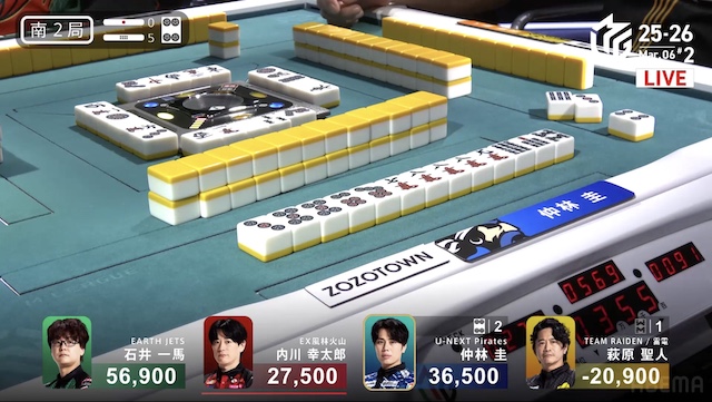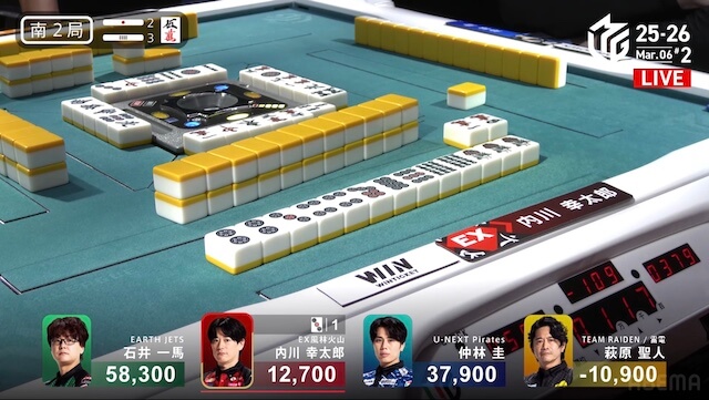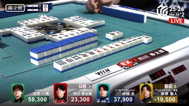 待ちのテンパイを取った。仲林が競り勝ってツモアガリ。裏ドラを2枚乗せて、2000・4000とし、トップ目の一馬まで4400点差に迫って南入する。