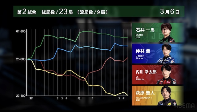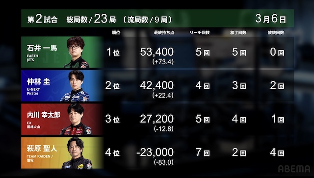 雷電が苦しむ結果に。雷電はABEMASのスコアを下回り7位に陥落、セミファイナル進出に向けてまだまだ息詰まる戦いが続いていきそうだ。