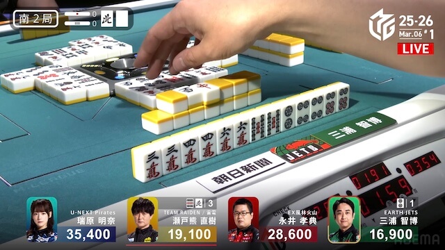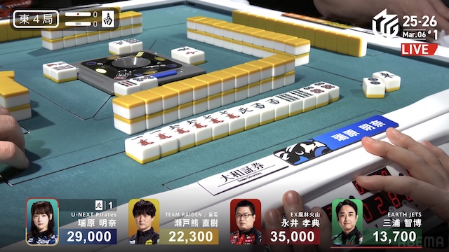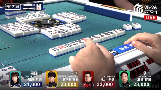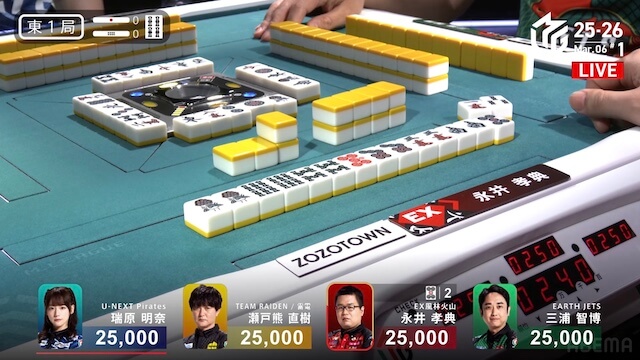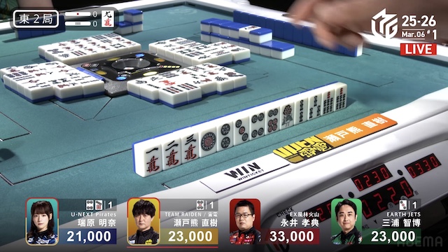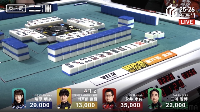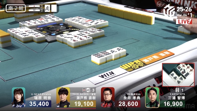 待ちで追いかけリーチ。待ちを変えた三浦とともにピンズ待ちの三軒テンパイは、瑞原が瀬戸熊からロンアガリで決着した。