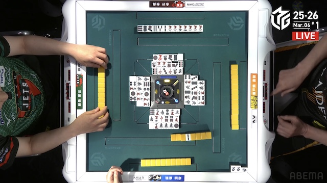 東2局、三浦が三副露してピンズに向かい、2枚切れている