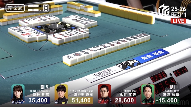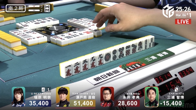 南2局1本場、4着目の三浦が6巡目に先制リーチ。瑞原は二副露してピンズのホンイツをテンパイ。さらに親の瀬戸熊が門前でテンパイを入れると、すぐに三浦からロンアガリ。12000は12300となった。