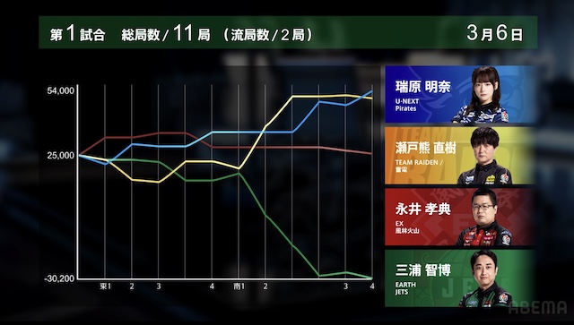 瀬戸熊選手が18000のアガリでトップ目に浮上⚡