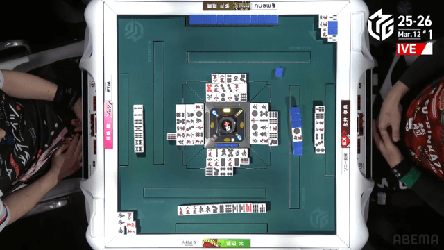 待ちの高め三色の先制テンパイを入れる。負けじと仕掛けを入れた多井がイーシャンテンからドラの