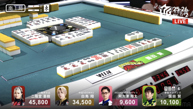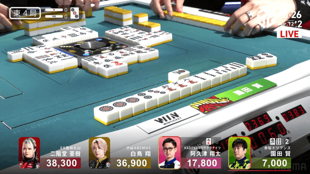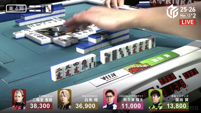 南3局4本場、溜まった供託を回収するために親番阿久津は序盤から
