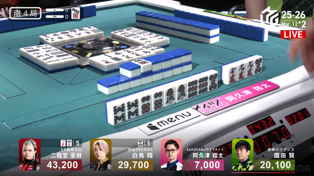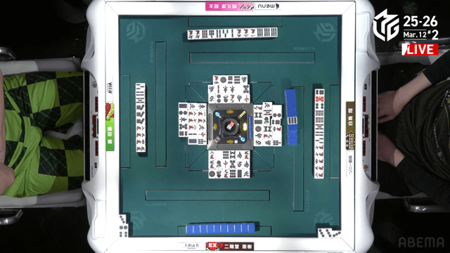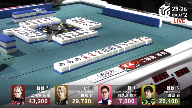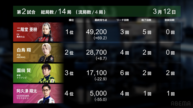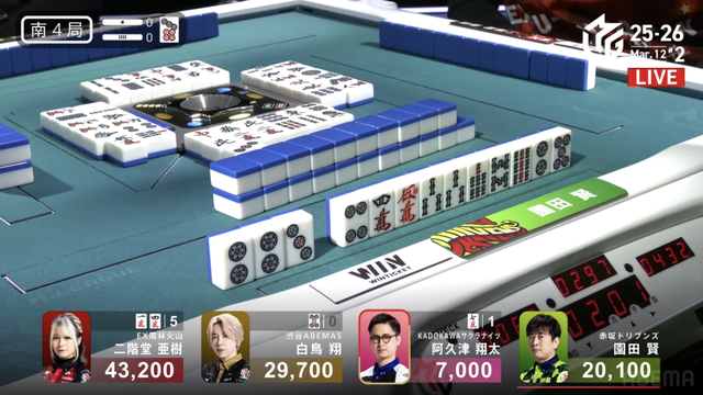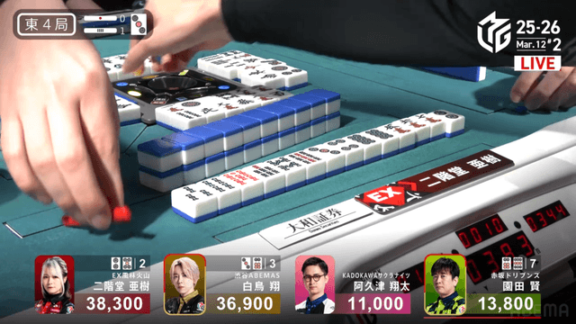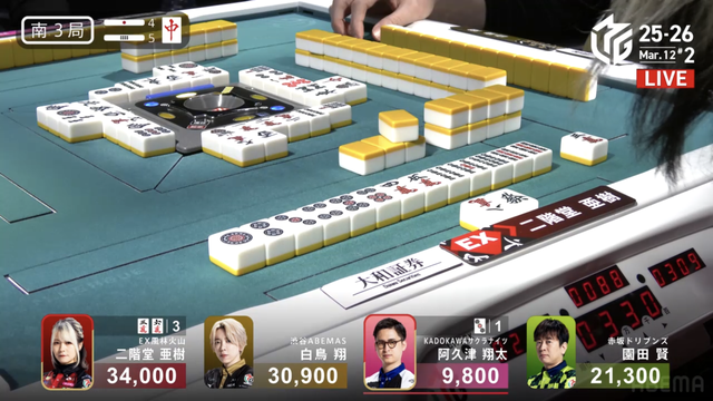 を引きテンパイを取り返すと、最後に阿久津もテンパイを取ることができ、3人テンパイで流局する。