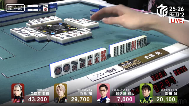 をチーして何とかテンパイを入れる。白鳥のハイテイツモを阻止したい園田は親にハイテイを回す選択をする。結果は白鳥、阿久津の2人テンパイで流局となった。