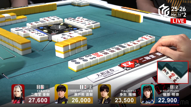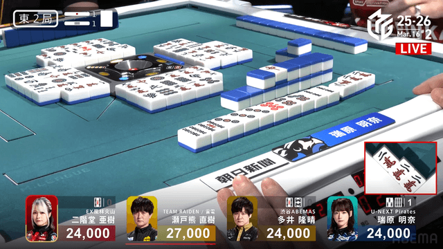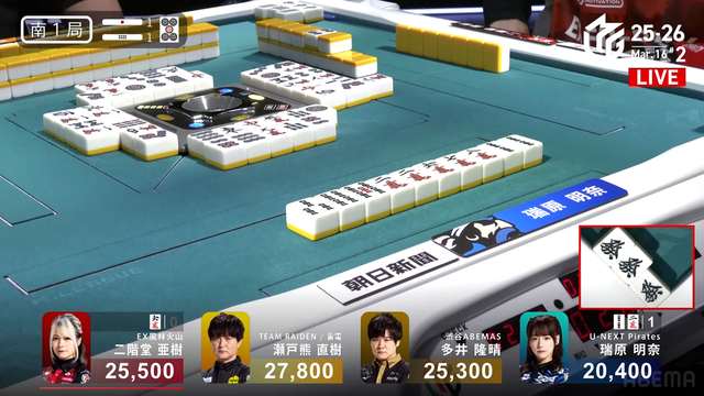 単騎待ちでリーチ。さらに仕掛けていた瑞原が![]()