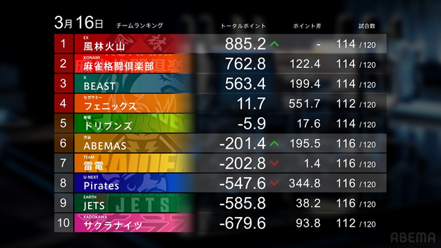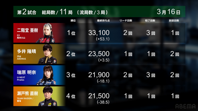 僅差のセミファイナル争いはABEMASと雷電は着順としては痛み分け、素点の差がありABEMASと雷電の差は1.4に縮まった。両チームの同卓はもうないため、残り4戦でそれぞれが何ポイント勝てるかにすべてがかかっている。ドリブンズ、フェニックスは6,7位とややポイント差が開いたのは安心材料と言えるだろう。