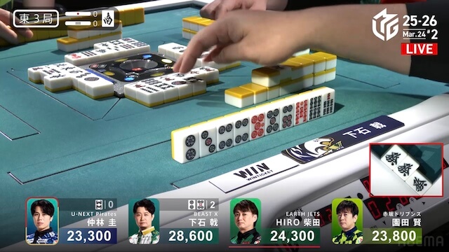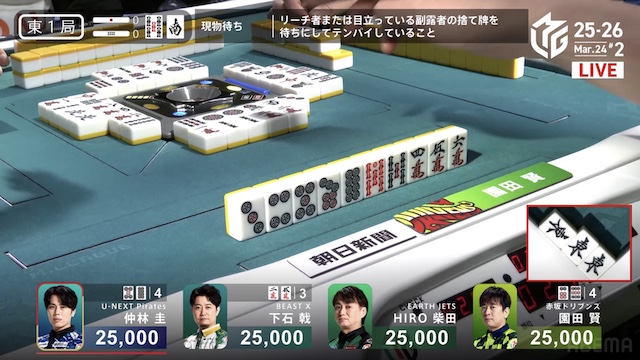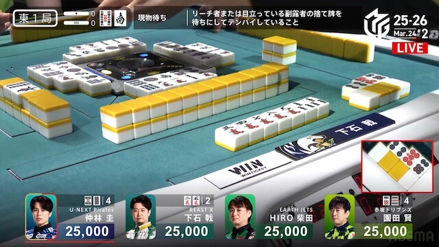 東1局、園田、下石が仕掛ける中、親の仲林が先制リーチ。園田が追いついてテンパイを入れると、下石もテンパイ。最後は園田がつかんだ