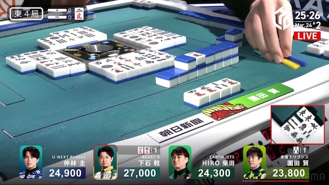 をポンして打点を上げ、タンキテンパイを果たす。終盤、下石がリーチ。二軒テンパイのめくり合いは、園田に軍配が上がった。仲林からロンアガリで、5800を加点し、園田がトップ目に立った。