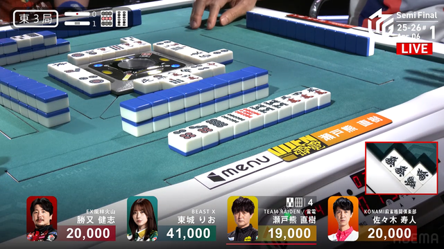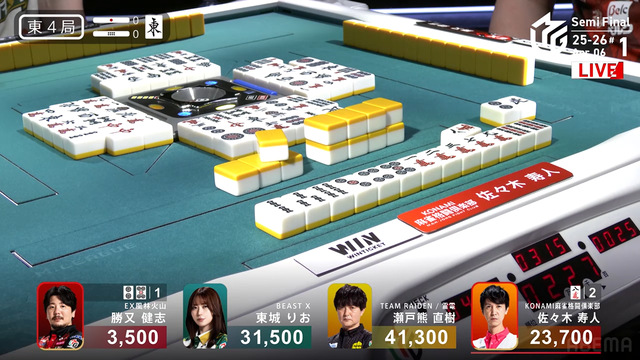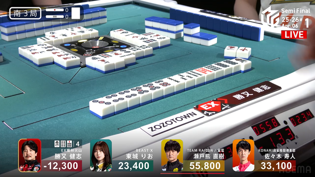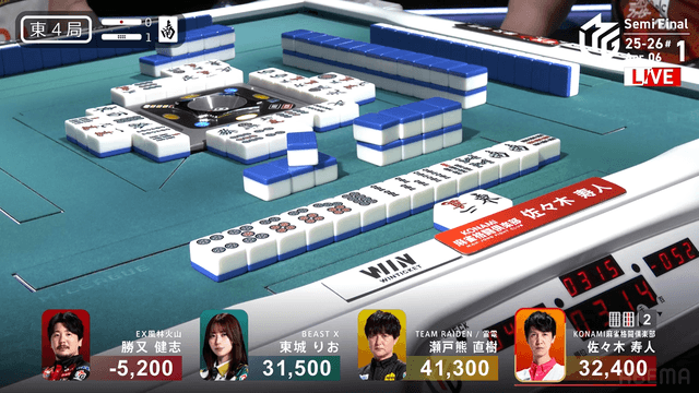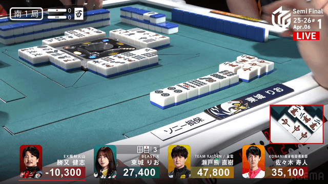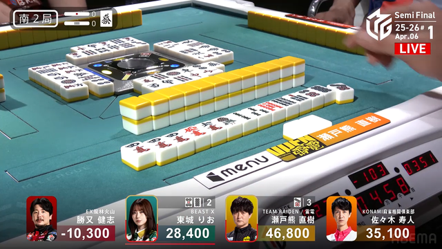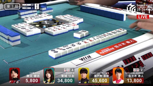 東3局2本場、東城選手が国士に進めば役満和了のチャンスがあった場面、親の瀬戸熊が[一][四]待ちで先制リーチ。瀬戸熊は一発で[一]をツモアガリ。6000オールのアガリで瀬戸熊はトップ目に立つ。ここが両者の運命の分かれ目となった。