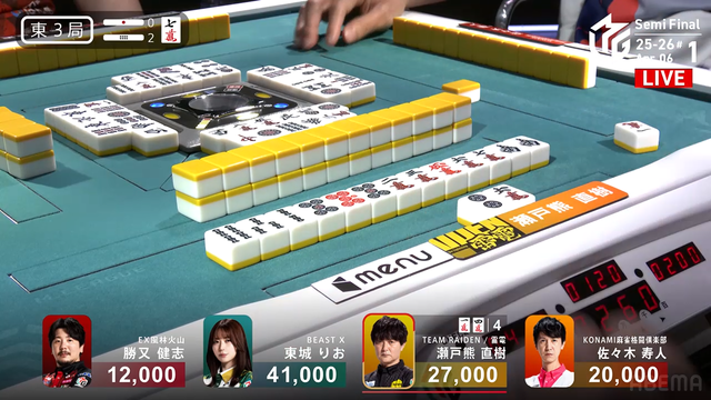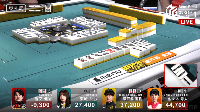 東4局2本場、勝又が[二][五]待ちでリーチ。そこに親の寿人がリーチ。さらに瀬戸熊が仕掛けて[四][七]待ちテンパイ。結果は寿人から[七]が出て瀬戸熊の満貫のアガリ。