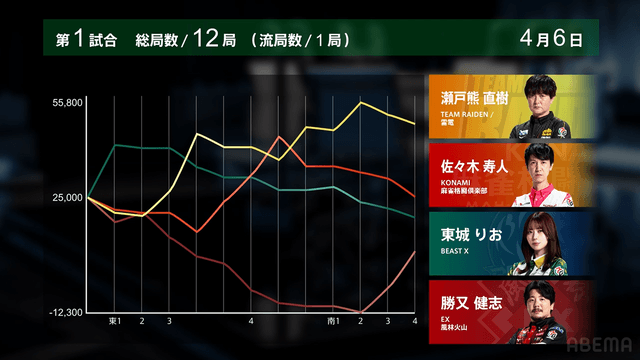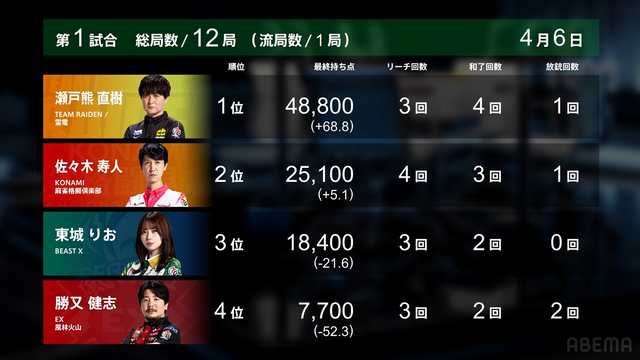 【4/6 Mリーグ2025-26 第1試合結果】譲れない高打点の応酬!瀬戸熊直樹は東3局2本場の6000オールでリードし、南場もダメ押しの加点を決めてトップ獲得!