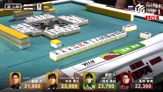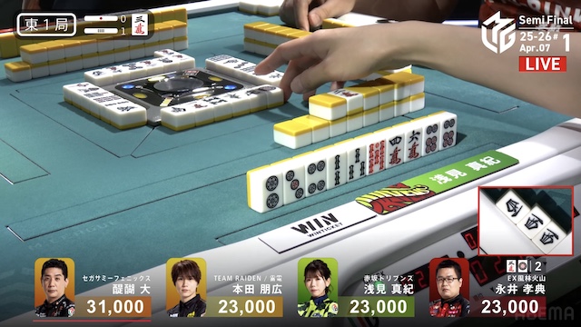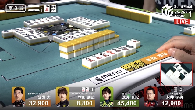 待ちの先制リーチ。本田のテンパイ打牌をとらえて、3900を加点し、連荘に成功した。