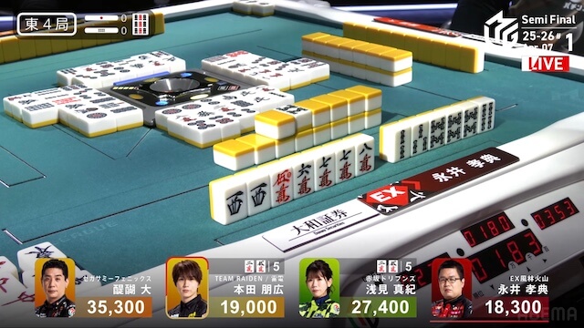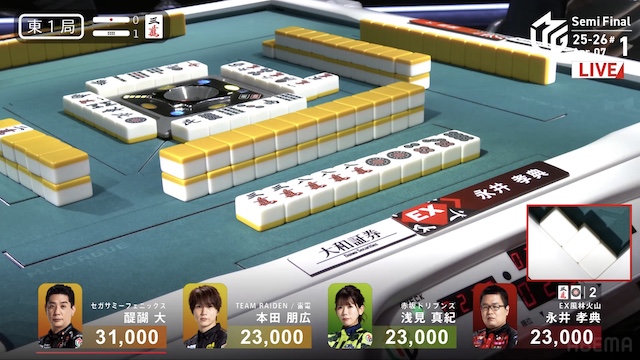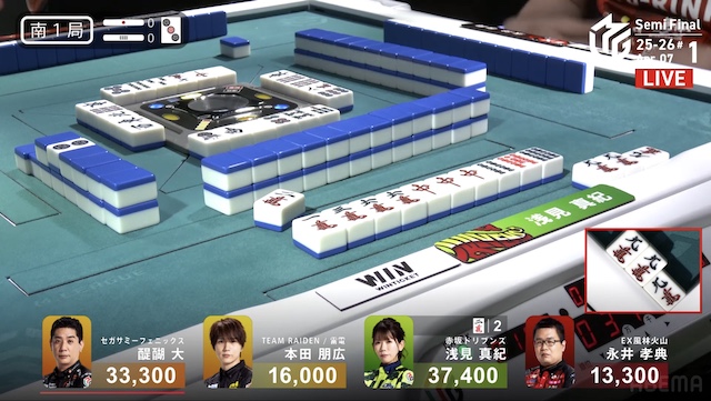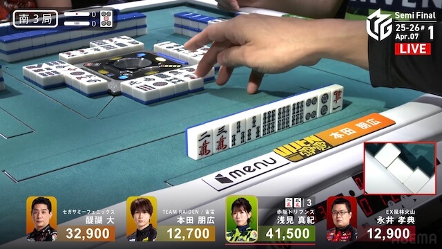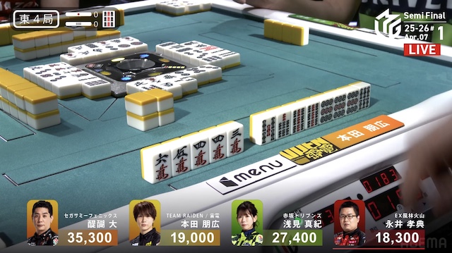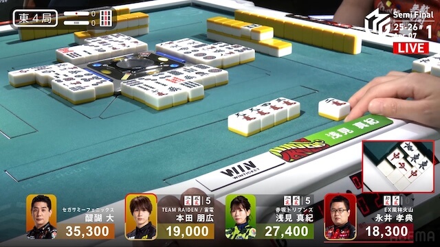 南4局、3着目の本田が先制リーチ。赤3ドラ内蔵で、ツモアガリなら2着目の醍醐をかわすことができる。しかし、この待ち牌が山から姿を消した後、4着目で親の永井がドラ