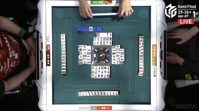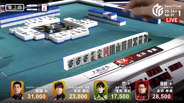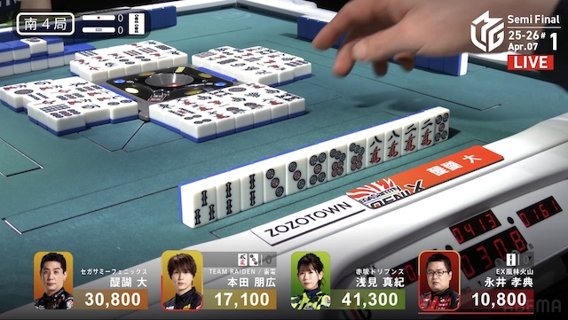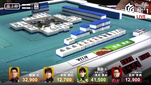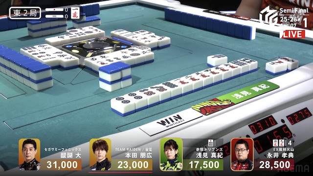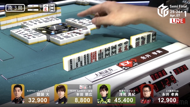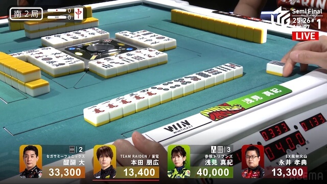 南2局、浅見が12巡目にファーストテンパイ。同巡、醍醐が仕掛けて形式テンパイを入れた。最後は浅見がツモアガリ。400・700で1局消化することに成功。