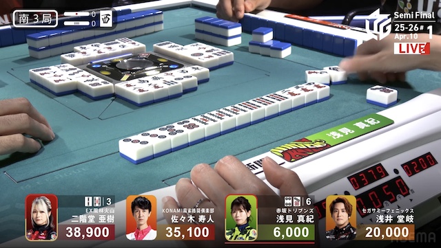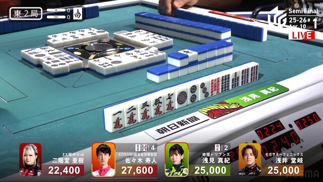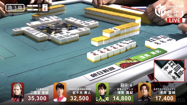 南3局、トップ目の亜樹が8巡目に先制リーチ。4着目で親の浅見は10巡目に追いついて、追いかけリーチで応戦すると、一発でツモアガリ。2600オールを手にして、連荘に成功した。